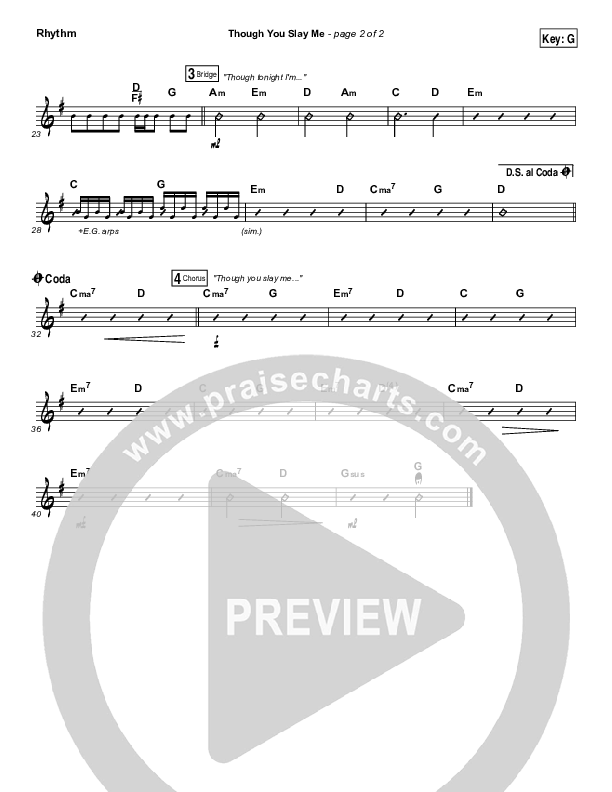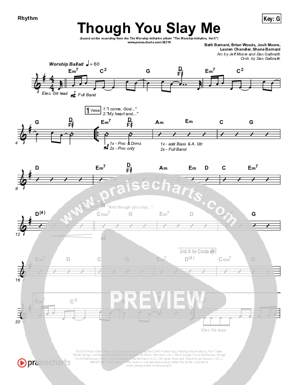 Download the Rhythm Chart for Though You Slay Me by Shane & Shane / The Worship Initiative, from the album The Worship Initiative Volume 5. This song was arranged by Jeff Moore / Daniel Galbraith in the key of F, G.