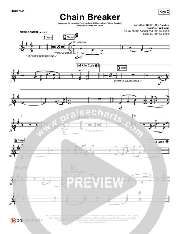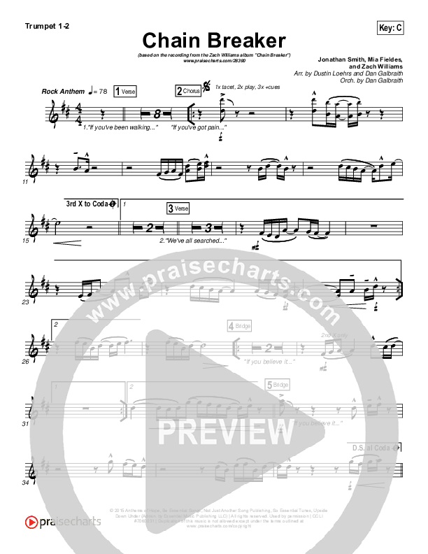 Download the Orchestration brass parts for Chain Breaker by Zach Williams, from the album Chain Breaker. This song was arranged by Dustin Loehrs / Daniel Galbraith in the key of A, Ab, Bb, C, G.