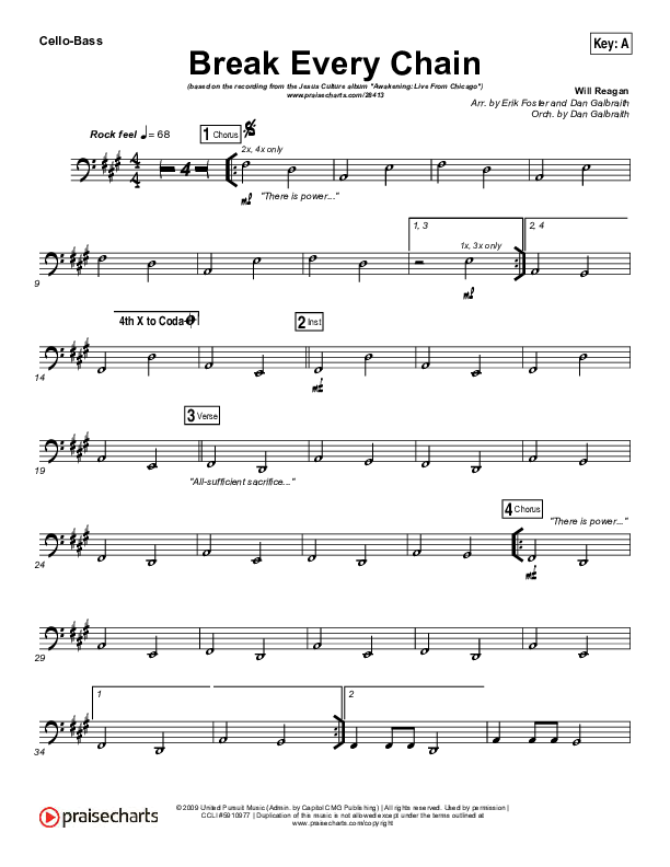 Download the Orchestration for Break Every Chain by Jesus Culture / Kristene DiMarco, from the album Awakening: Live From Chicago. This song was arranged by Erik Foster / Daniel Galbraith in the key of A, B, Bb, C, D.