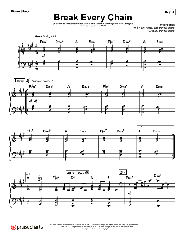 Download the Orchestration for Break Every Chain by Jesus Culture / Kristene DiMarco, from the album Awakening: Live From Chicago. This song was arranged by Erik Foster / Daniel Galbraith in the key of A, B, Bb, C, D.