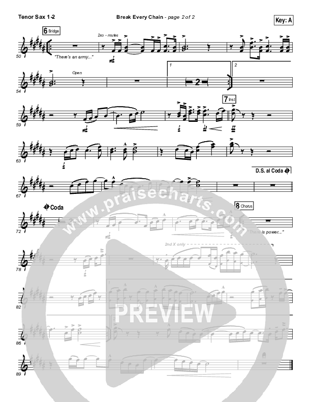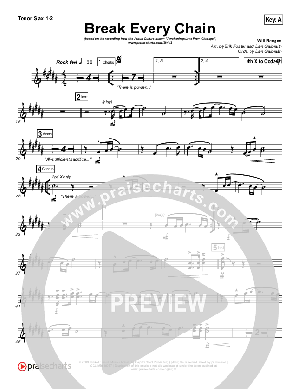 Download the Tenor Sax sheet music for Break Every Chain by Jesus Culture / Kristene DiMarco, from the album Awakening: Live From Chicago. This song was arranged by Erik Foster / Daniel Galbraith in the key of A, B, Bb, C, D.