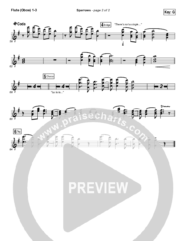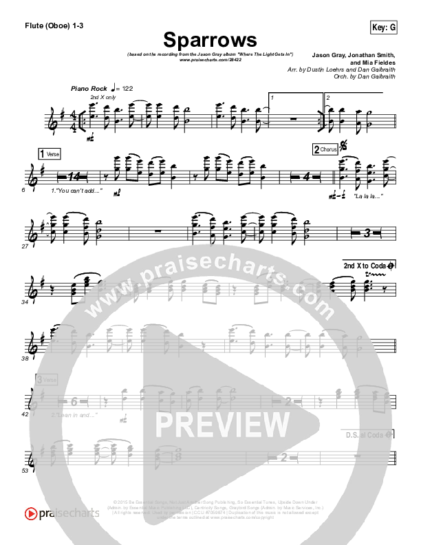 Download the Flute/Oboe sheet music for Sparrows by Jason Gray, from the album Where The Light Gets In. This song was arranged by Dustin Loehrs / Daniel Galbraith in the key of F, G.