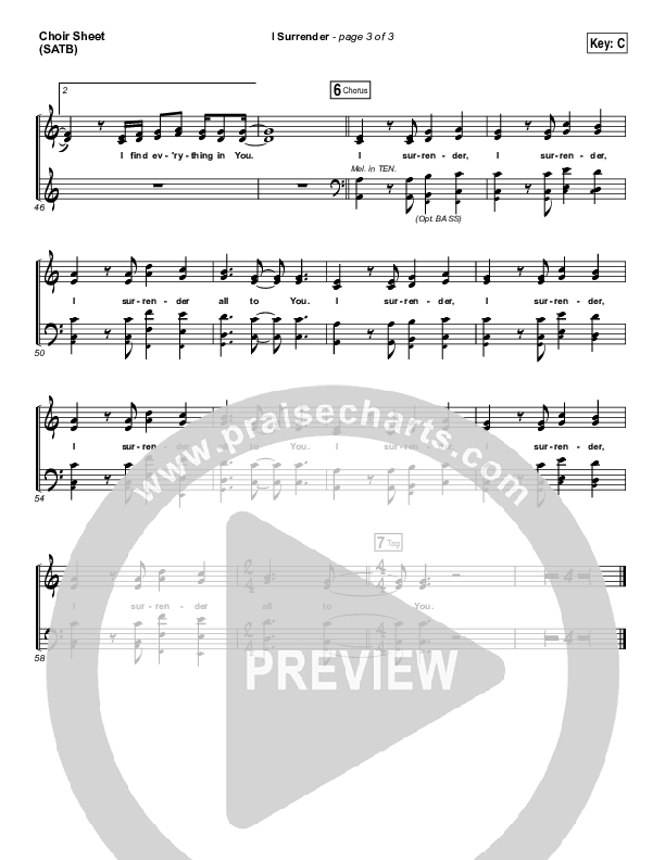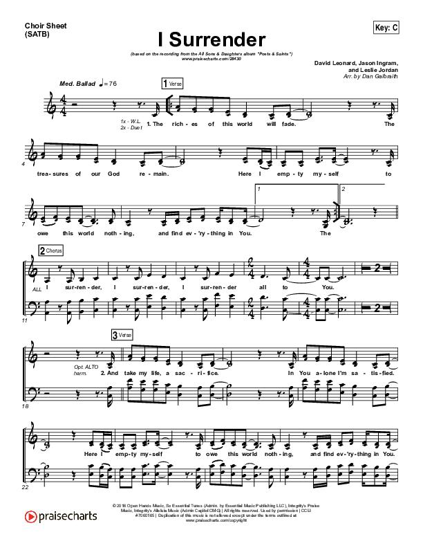 Download the Choir Sheet for I Surrender by All Sons & Daughters, from the album Poets & Saints. This song was arranged by Daniel Galbraith in the key of Bb, C.