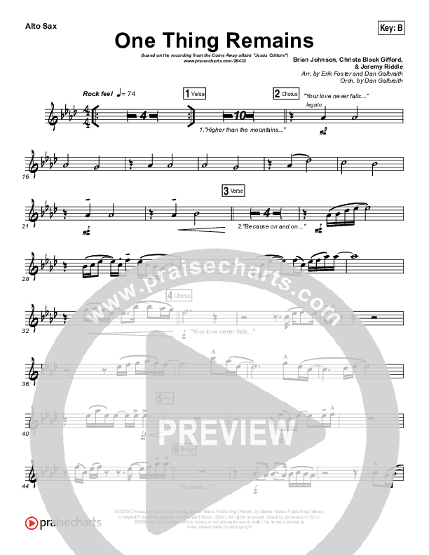 Download the AltoSax sheet music for One Thing Remains by Jesus Culture, from the album Come Away. This song was arranged by Erik Foster / Daniel Galbraith in the key of B, Bb.