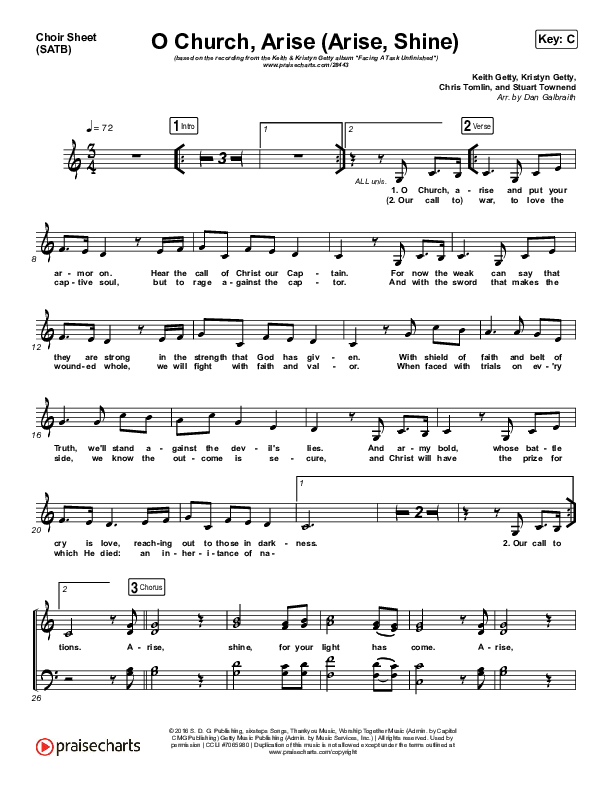 Download the Choir Sheet for O Church Arise (Arise Shine) by Keith & Kristyn Getty, from the album Facing A Task Unfinished. This song was arranged by Daniel Galbraith in the key of C, D.