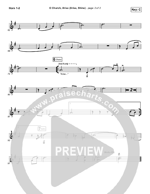 Download the French Horn sheet music for O Church Arise (Arise Shine) by Keith & Kristyn Getty, from the album Facing A Task Unfinished. This song was arranged by Daniel Galbraith in the key of C, D.