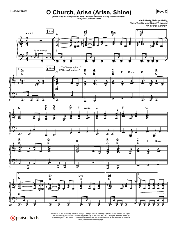 Download the piano sheet for O Church Arise (Arise Shine) by Keith & Kristyn Getty, from the album Facing A Task Unfinished. This song was arranged by Daniel Galbraith in the key of C, D.