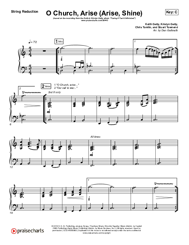 Download the Orchestration for O Church Arise (Arise Shine) by Keith & Kristyn Getty, from the album Facing A Task Unfinished. This song was arranged by Daniel Galbraith in the key of C, D.