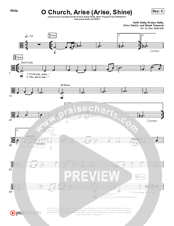 Download the Viola sheet music for O Church Arise (Arise Shine) by Keith & Kristyn Getty, from the album Facing A Task Unfinished. This song was arranged by Daniel Galbraith in the key of C, D.