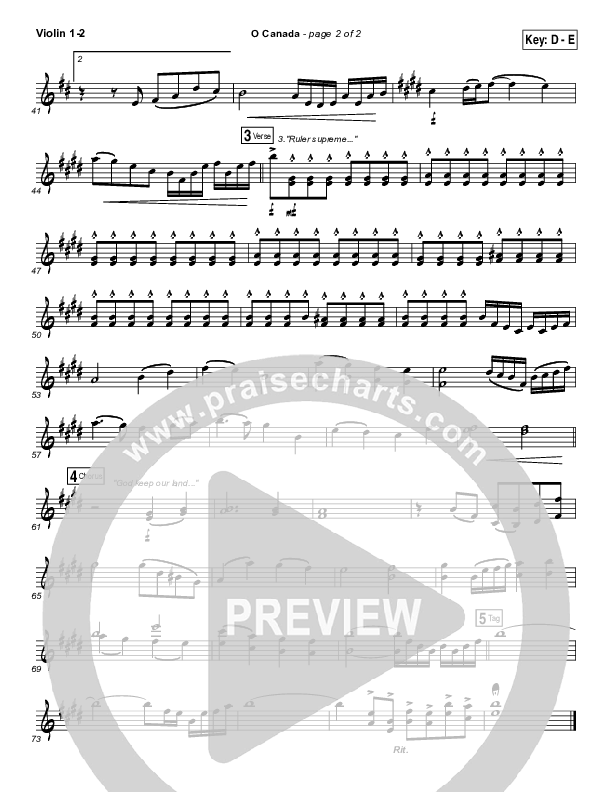 Download the Violin sheet music for O Canada by PraiseCharts Band, from the album O Canada. This song was arranged by Daniel Galbraith in the key of C, D.