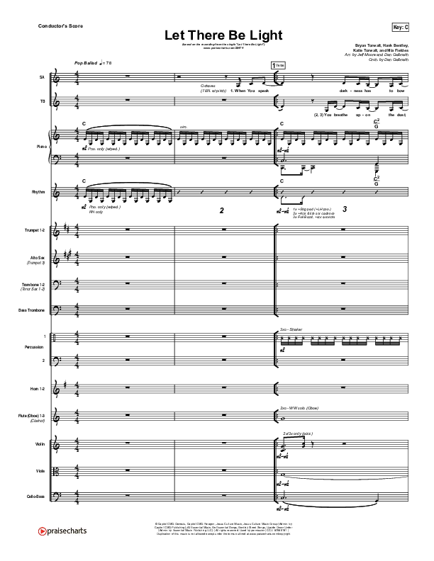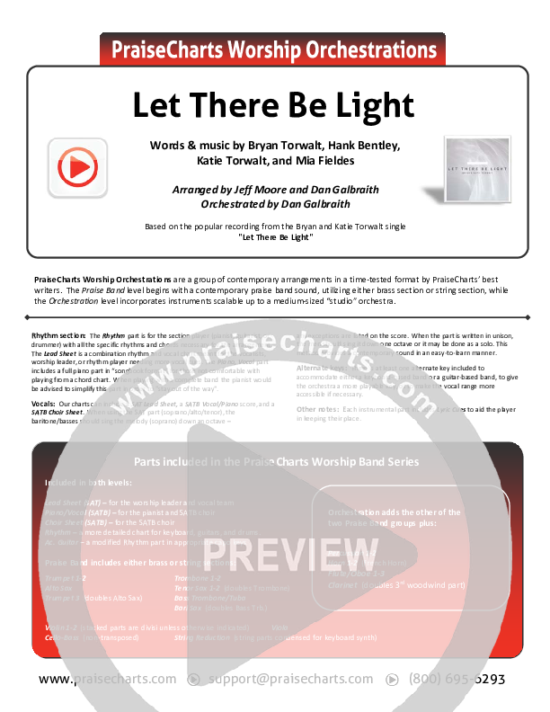 Download the Orchestration for Let There Be Light by Bryan & Katie Torwalt, from the album Champion. This song was arranged by Jeff Moore / Daniel Galbraith in the key of B, C.