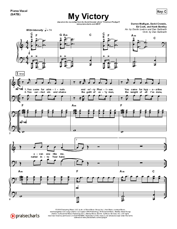Download the sheet music for My Victory by David Crowder, from the album American Prodigal. This song was arranged by Dustin Loehrs / Daniel Galbraith in the key of B, Bb, C.