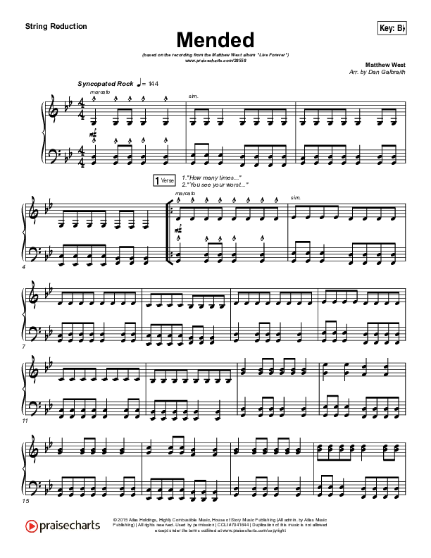 Download the Orchestration string parts for Mended by Matthew West, from the album Live Forever. This song was arranged by Daniel Galbraith in the key of A, Bb.