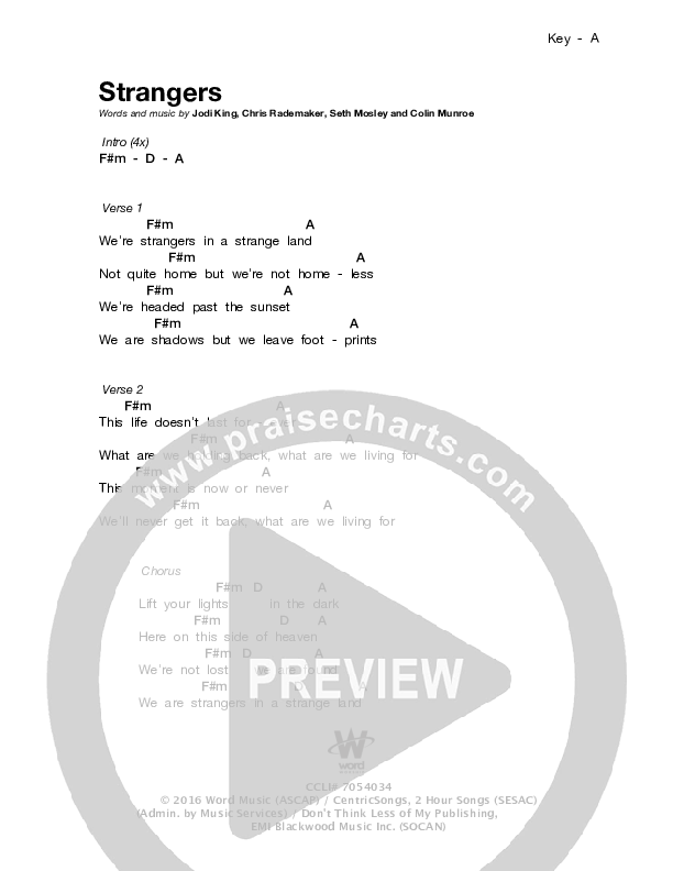 Download the PDF Chord Charts for Strangers by Love & The Outcome, from the album These Are The Days. This song was arranged by Word Music in the key of A, G.