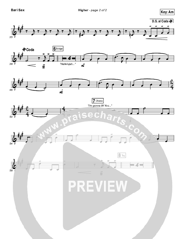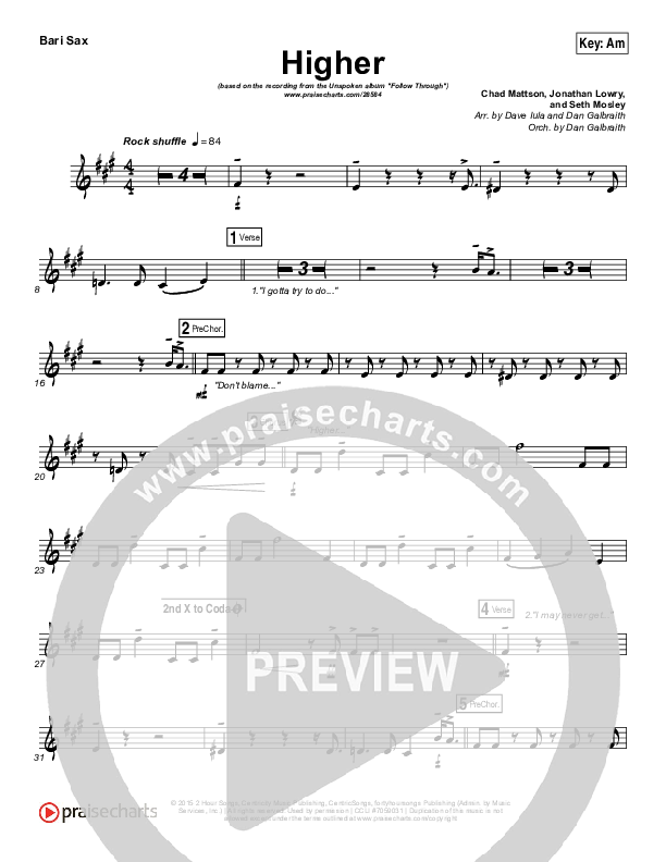 Download the Bari Sax sheet music for Higher by Unspoken, from the album Follow Through. This song was arranged by Dave Iula / Daniel Galbraith in the key of Am, Gm.