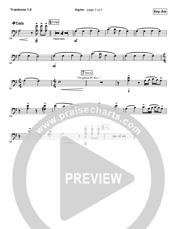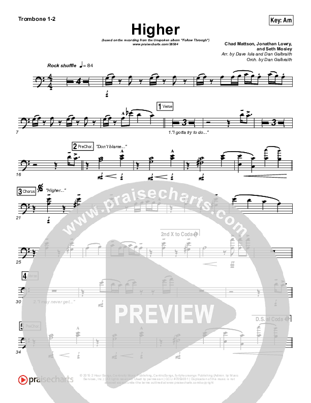 Download the Trombone 1,2 sheet music for Higher by Unspoken, from the album Follow Through. This song was arranged by Dave Iula / Daniel Galbraith in the key of Am, Gm.