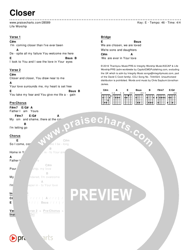 Download the PDF Chord Charts for Closer by Life Worship, from the album Wide Open Space. This song was arranged by Integrity Music in the key of E.
