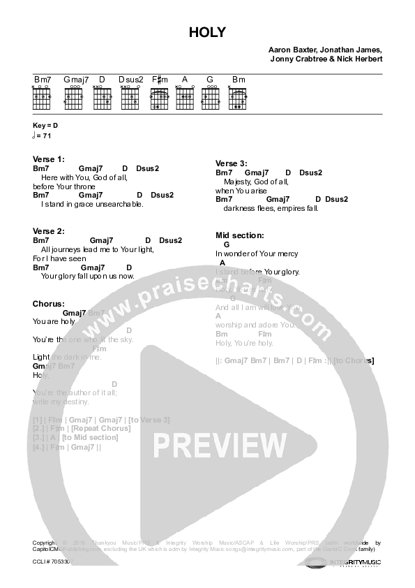 Download the PDF Chord Charts for Holy by Life Worship, from the album Wide Open Space. This song was arranged by Integrity Music in the key of D.