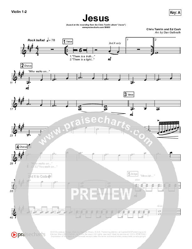 Download the Violin sheet music for Jesus by Chris Tomlin, from the album Never Lose Sight. This song was arranged by Daniel Galbraith in the key of A, Ab, E, Eb, F, G.
