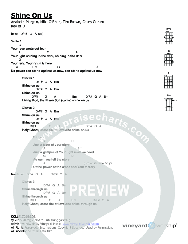 Download the PDF Chord Charts for Shine On Us by Vineyard Worship / Anabeth Morgan, from the album Shine On Us: Live From Cause Con. This song was arranged by Vineyard Music in the key of D.