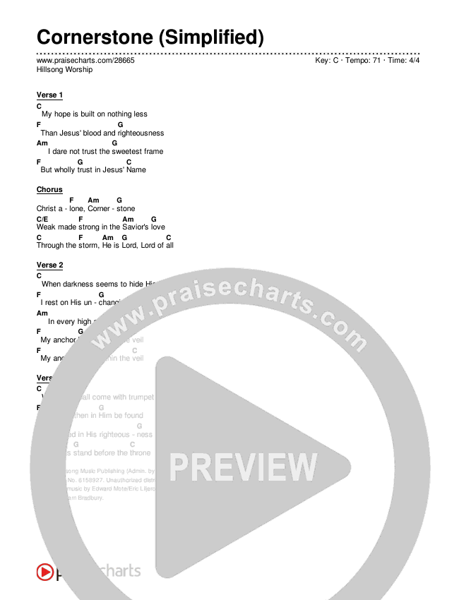 Download the PDF Chord Charts for Cornerstone by Hillsong Worship, from the album Simplified Worship. This song was arranged by PraiseCharts in the key of A, Ab, B, Bb, C, D, Db, E, Eb, F, G, Gb.