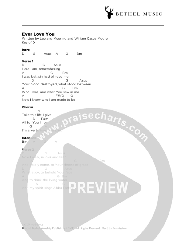 Download the PDF Chord Charts for Ever Love You by Leeland, from the album Invisible. This song was arranged by Bethel Music in the key of D.