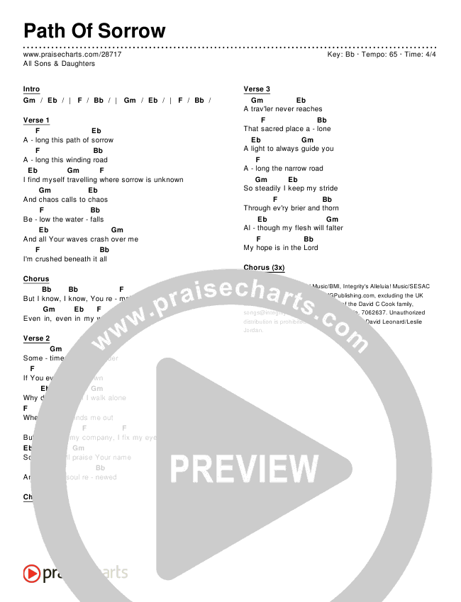 Download the PDF Chord Charts for Path Of Sorrow by All Sons & Daughters, from the album Poets & Saints. This song was arranged by Integrity Music in the key of Bb.