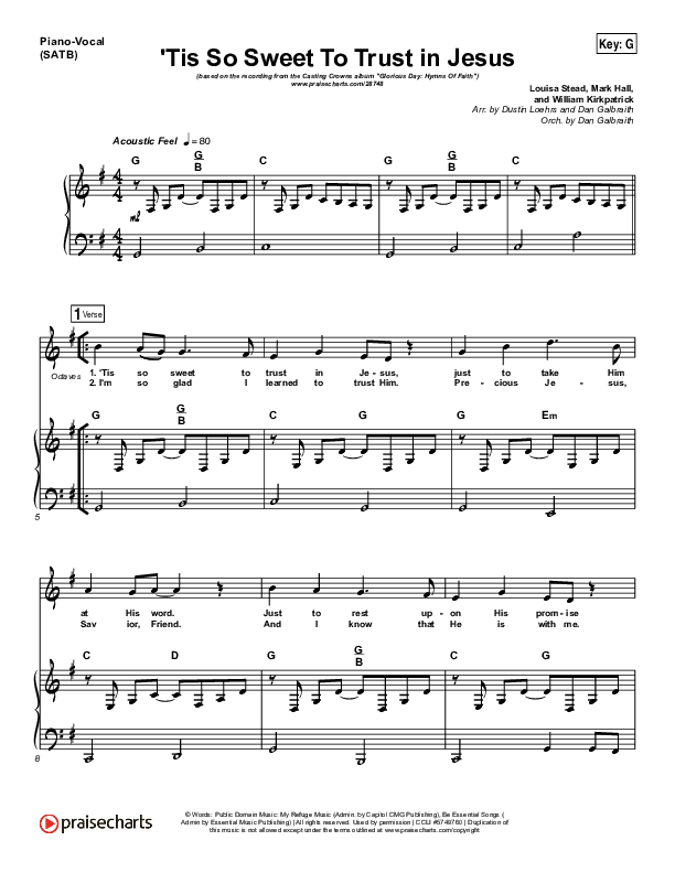 Download the sheet music for Tis So Sweet To Trust In Jesus by Casting Crowns, from the album Glorious Day: Hymns Of Faith. This song was arranged by Dustin Loehrs / Daniel Galbraith in the key of F, G.