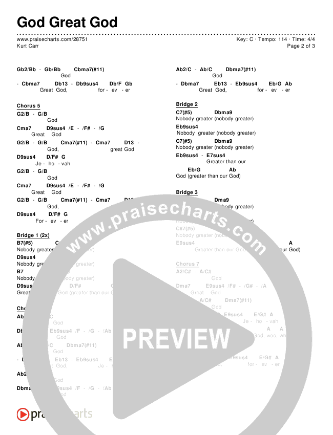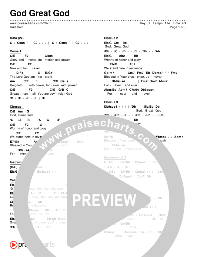 Download the PDF Chord Charts for God Great God by Kurt Carr, from the album One Church. This song was arranged by Jeff Moore in the key of C, D.