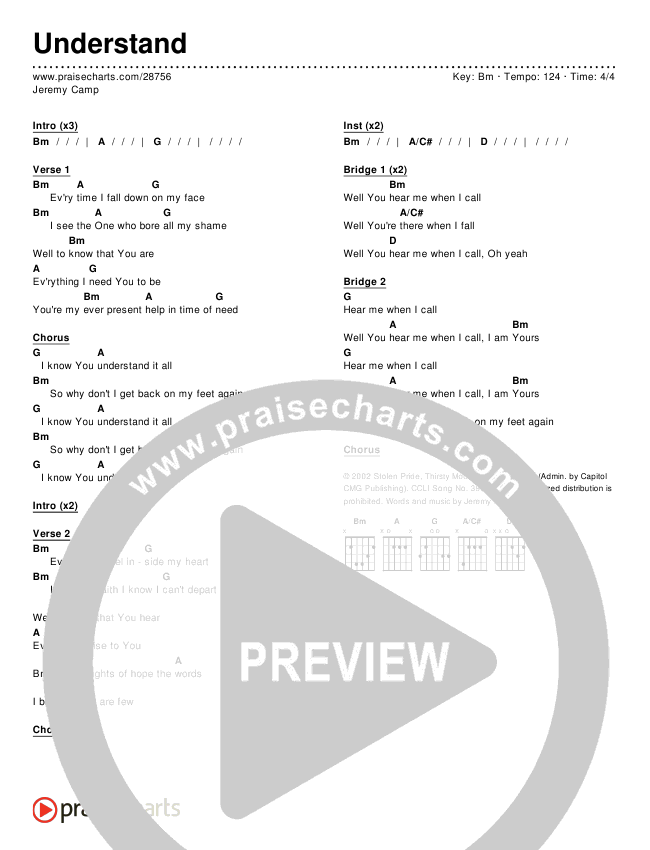 Download the PDF Chord Charts for Understand by Jeremy Camp, from the album Stay. This song was arranged by Shane Ohlson in the key of Bm.