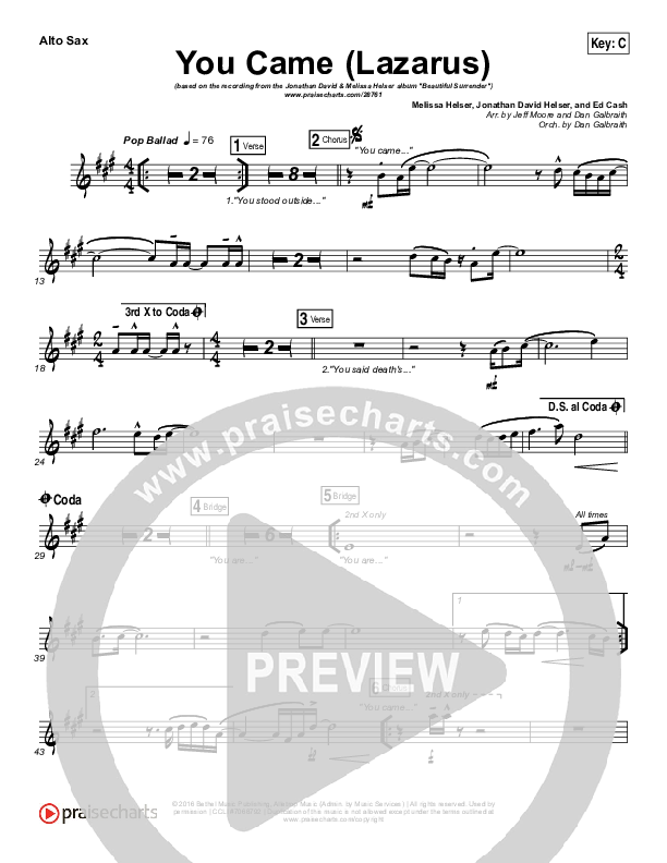 Download the AltoSax sheet music for You Came (Lazarus) by Jonathan David Helser / Melissa Helser, from the album Beautiful Surrender. This song was arranged by Jeff Moore / Daniel Galbraith in the key of Bb, C.