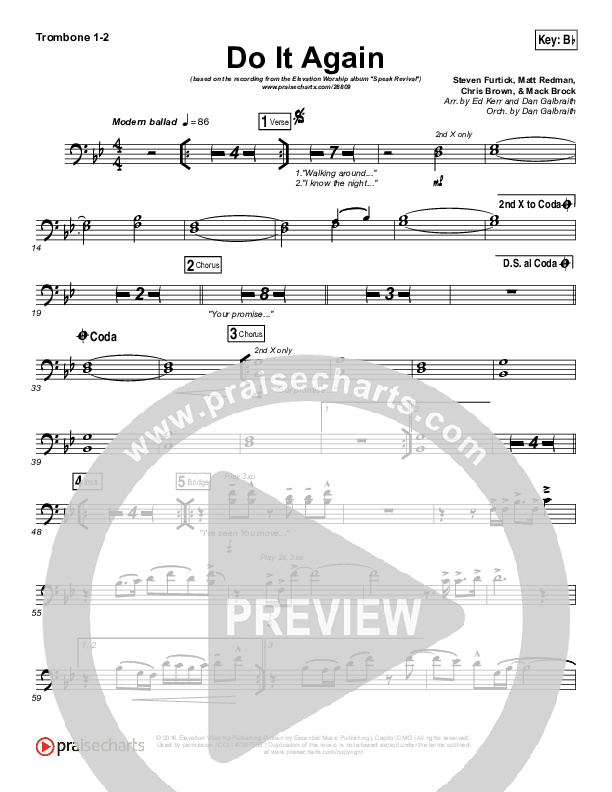 Download the Trombone 1,2 sheet music for Do It Again by Elevation Worship, from the album Speak Revival. This song was arranged by Ed Kerr / Daniel Galbraith in the key of A, Bb, G.