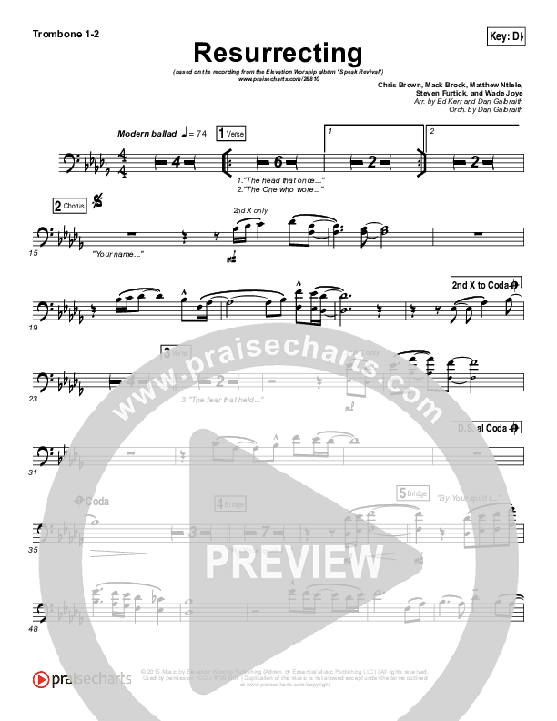 Download the Trombone 1,2 sheet music for Resurrecting (Studio) by Elevation Worship, from the album Speak Revival. This song was arranged by Ed Kerr / Daniel Galbraith in the key of C, Db.