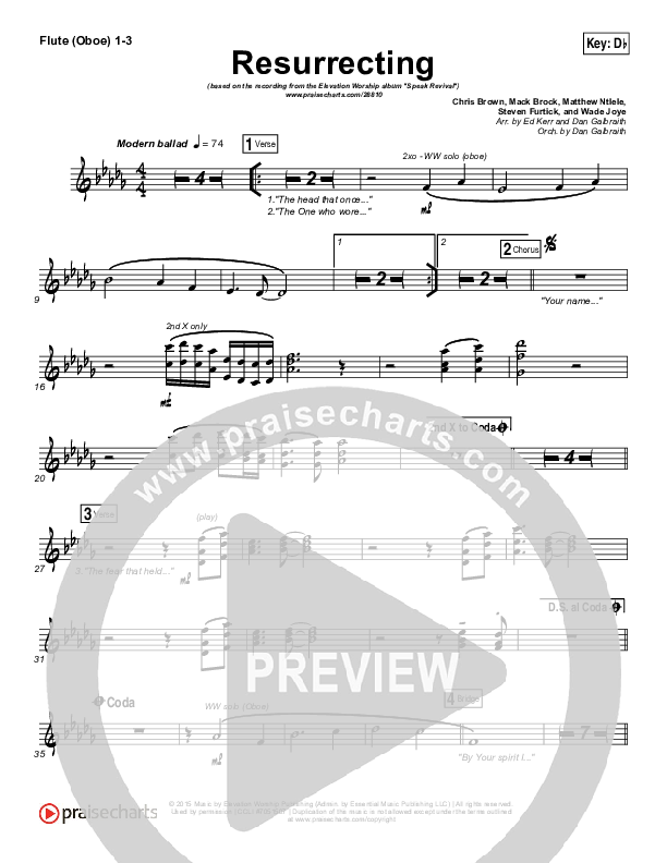 Download the Orchestration wind parts for Resurrecting (Studio) by Elevation Worship, from the album Speak Revival. This song was arranged by Ed Kerr / Daniel Galbraith in the key of C, Db.