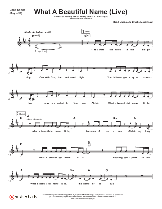 Download the sheet music for What A Beautiful Name (Live) by Hillsong Worship, from the album Let There Be Light. This song was arranged by Daniel Galbraith in the key of Bb, C, D, Db, E, Eb, F, G.