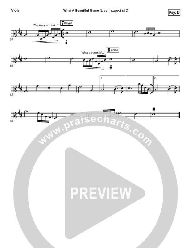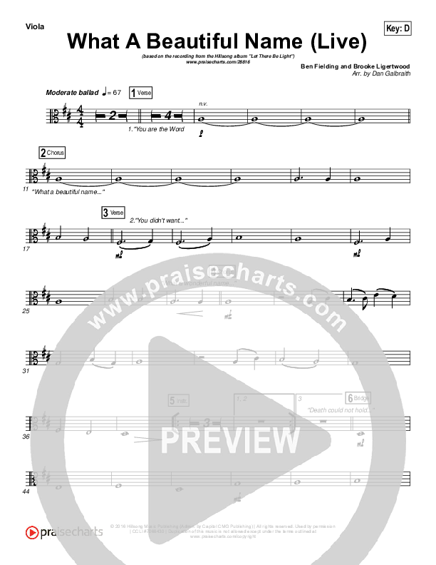 Download the Viola sheet music for What A Beautiful Name (Live) by Hillsong Worship, from the album Let There Be Light. This song was arranged by Daniel Galbraith in the key of Bb, C, D, Db, E, Eb, F, G.