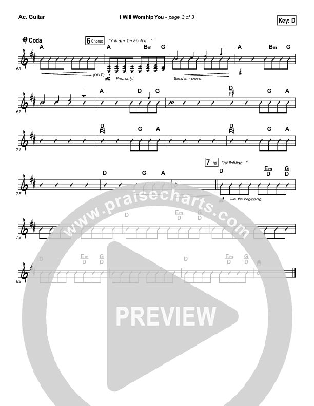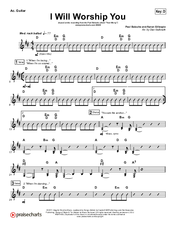 Download the Acoustic Guitar sheet music for I Will Worship You by Paul Baloche, from the album Your Mercy. This song was arranged by Daniel Galbraith in the key of C, D.