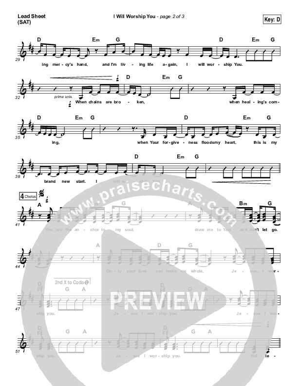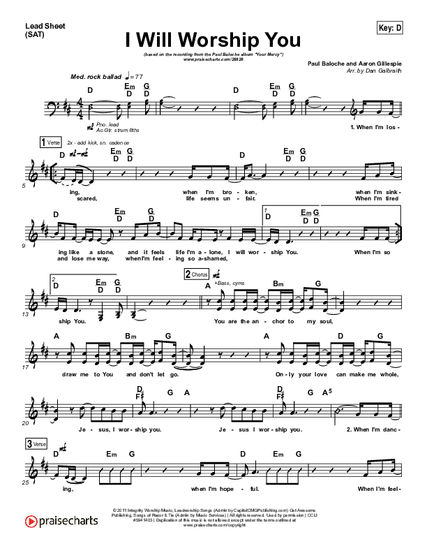 Download the sheet music for I Will Worship You by Paul Baloche, from the album Your Mercy. This song was arranged by Daniel Galbraith in the key of C, D.