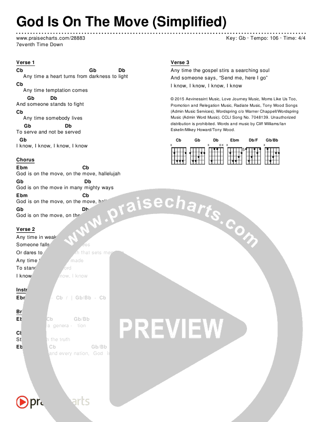 Download the PDF Chord Charts for God Is On The Move by 7eventh Time Down, from the album Simplified Worship. This song was arranged by PraiseCharts in the key of A, Ab, B, Bb, C, D, Db, E, Eb, F, G, Gb.