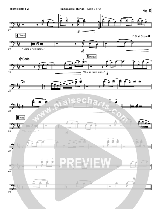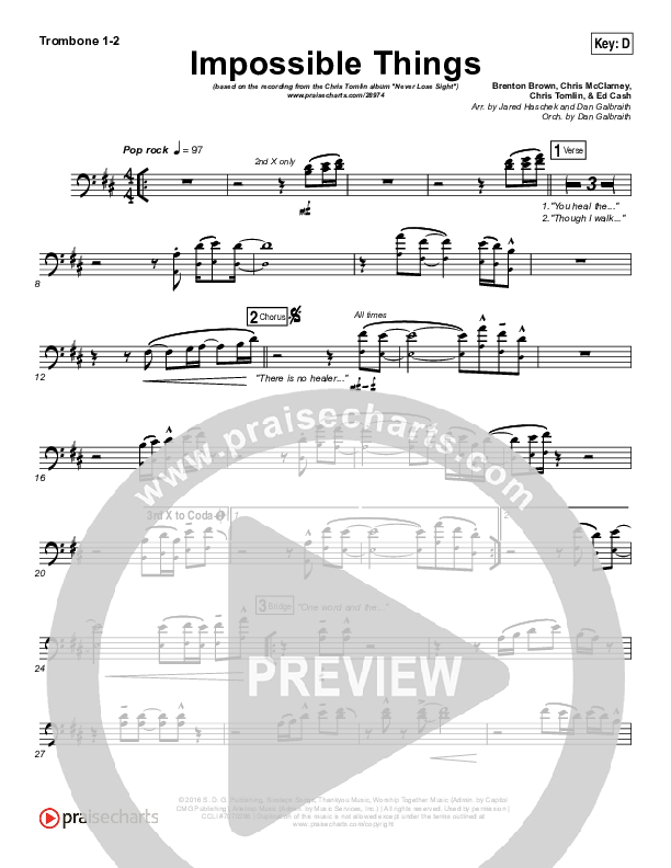 Download the Trombone 1,2 sheet music for Impossible Things by Chris Tomlin / Danny Gokey, from the album Never Lose Sight. This song was arranged by Jared Haschek / Daniel Galbraith in the key of C, D.