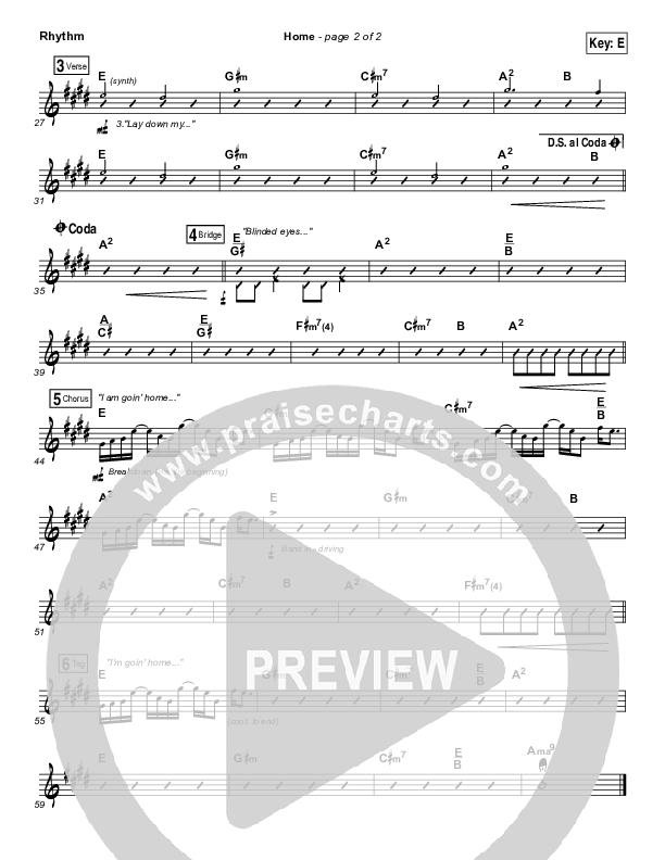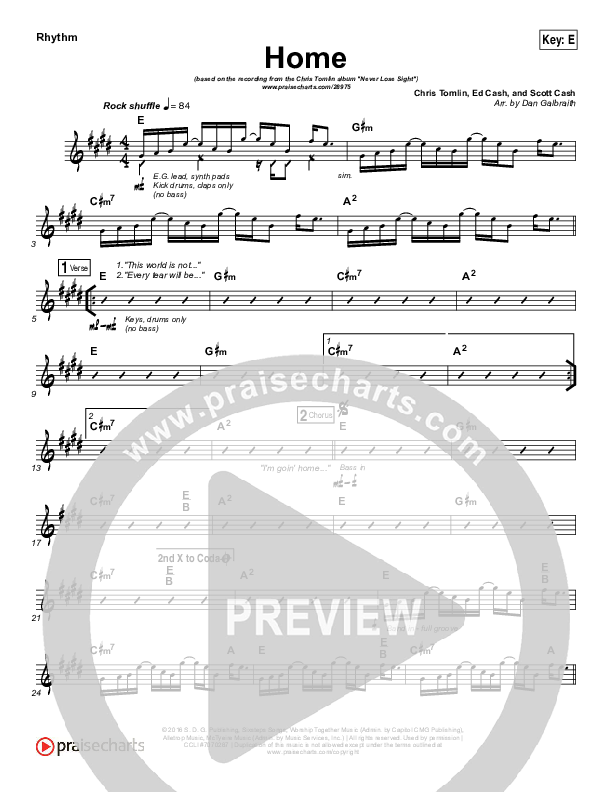 Download the Rhythm Chart for Home by Chris Tomlin, from the album Never Lose Sight. This song was arranged by Daniel Galbraith in the key of C, D, E.