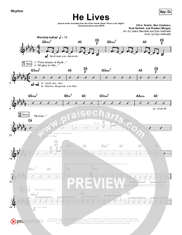 Download the Rhythm Chart for He Lives by Chris Tomlin, from the album Never Lose Sight. This song was arranged by Jared Haschek / Daniel Galbraith in the key of C, Db.