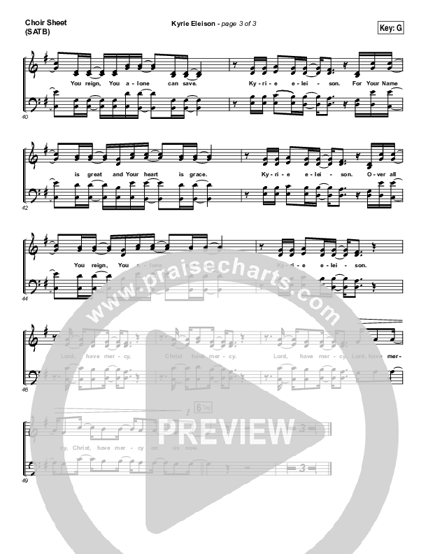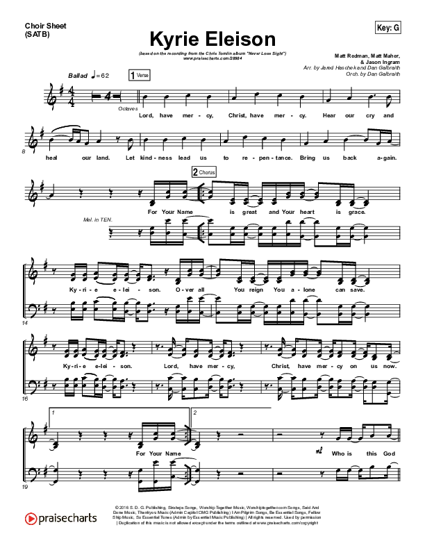 Download the Choir Sheet for Kyrie Eleison by Chris Tomlin / Matt Maher / Jason Ingram, from the album Never Lose Sight. This song was arranged by Jared Haschek / Daniel Galbraith in the key of F, G.