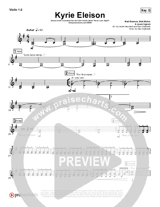 Download the Orchestration string parts for Kyrie Eleison by Chris Tomlin / Matt Maher / Jason Ingram, from the album Never Lose Sight. This song was arranged by Jared Haschek / Daniel Galbraith in the key of F, G.