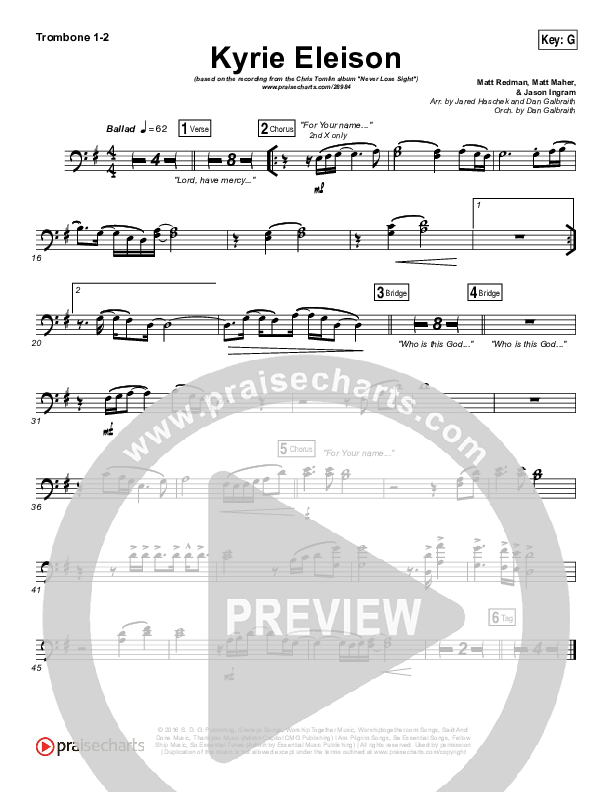 Download the Trombone 1,2 sheet music for Kyrie Eleison by Chris Tomlin / Matt Maher / Jason Ingram, from the album Never Lose Sight. This song was arranged by Jared Haschek / Daniel Galbraith in the key of F, G.