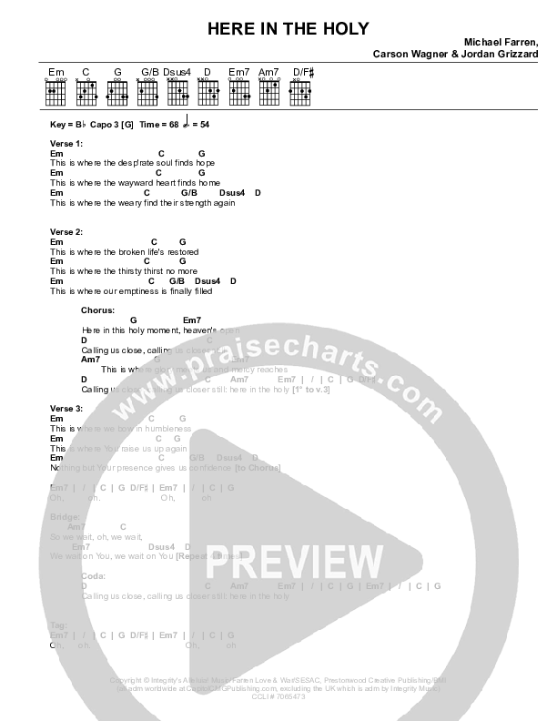 Download the PDF Chord Charts for Here In The Holy by Prestonwood Worship / Jordan Grizzard, from the album Songs Of The People. This song was arranged by Integrity Music in the key of Bb.