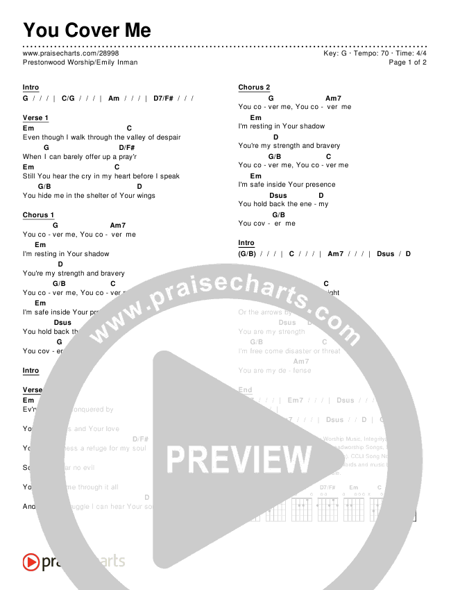 Download the PDF Chord Charts for You Cover Me by Prestonwood Worship / Emily Inman, from the album Songs Of The People. This song was arranged by Integrity Music in the key of G.