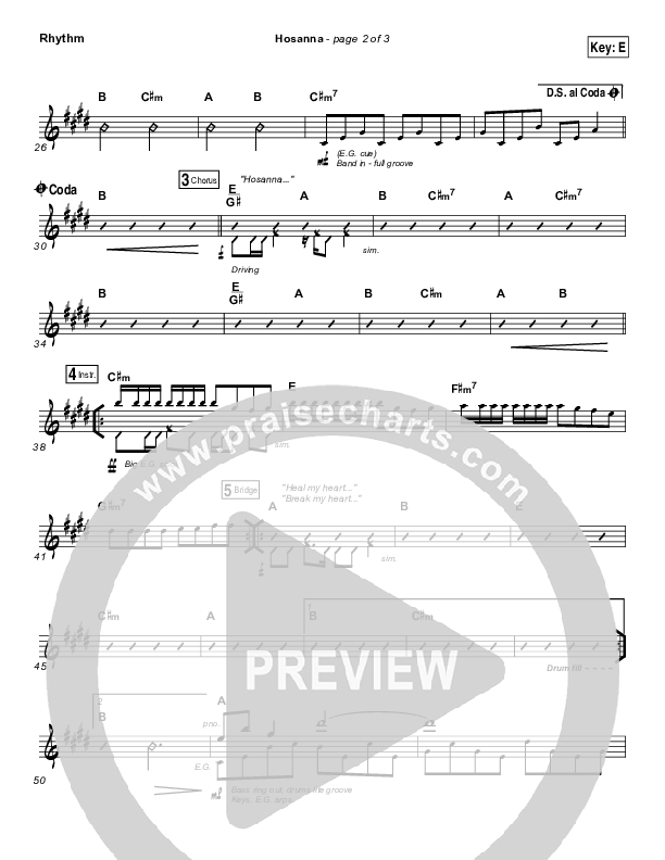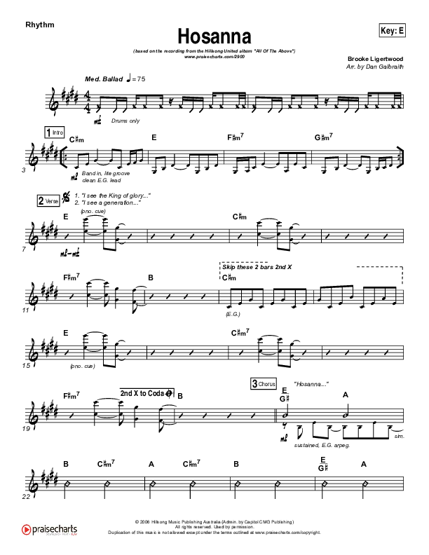 Download the Rhythm Chart for Hosanna by Hillsong UNITED, from the album All Of The Above. This song was arranged by Daniel Galbraith in the key of E, Eb.