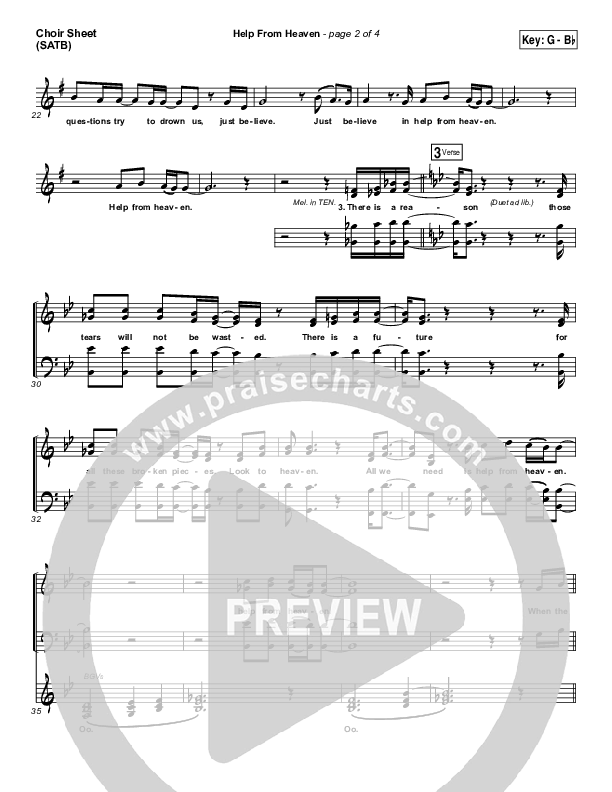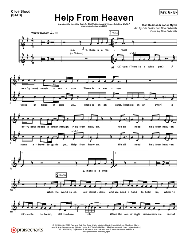 Download the Choir Sheet for Help From Heaven by Matt Redman / Natasha Bedingfield, from the album These Christmas Lights. This song was arranged by Erik Foster / Daniel Galbraith in the key of F, G.