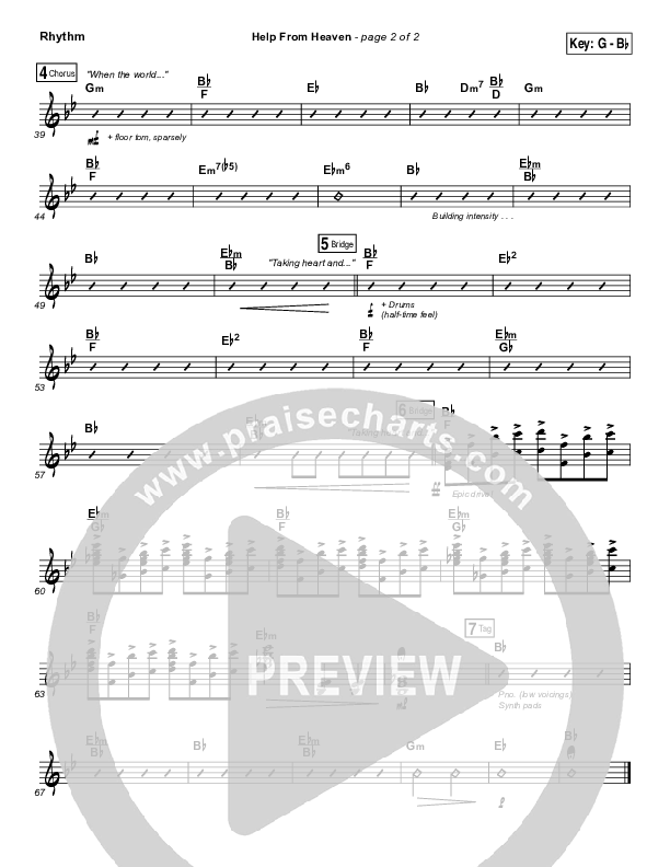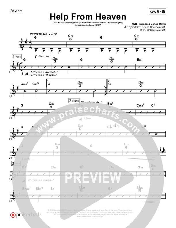 Download the Rhythm Chart for Help From Heaven by Matt Redman / Natasha Bedingfield, from the album These Christmas Lights. This song was arranged by Erik Foster / Daniel Galbraith in the key of F, G.